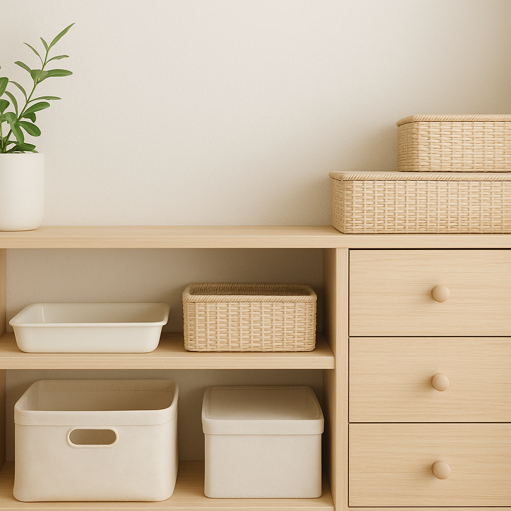 浅いトレーや小さなカゴをひとつ置くだけでも、物が散らばりにくくなります。